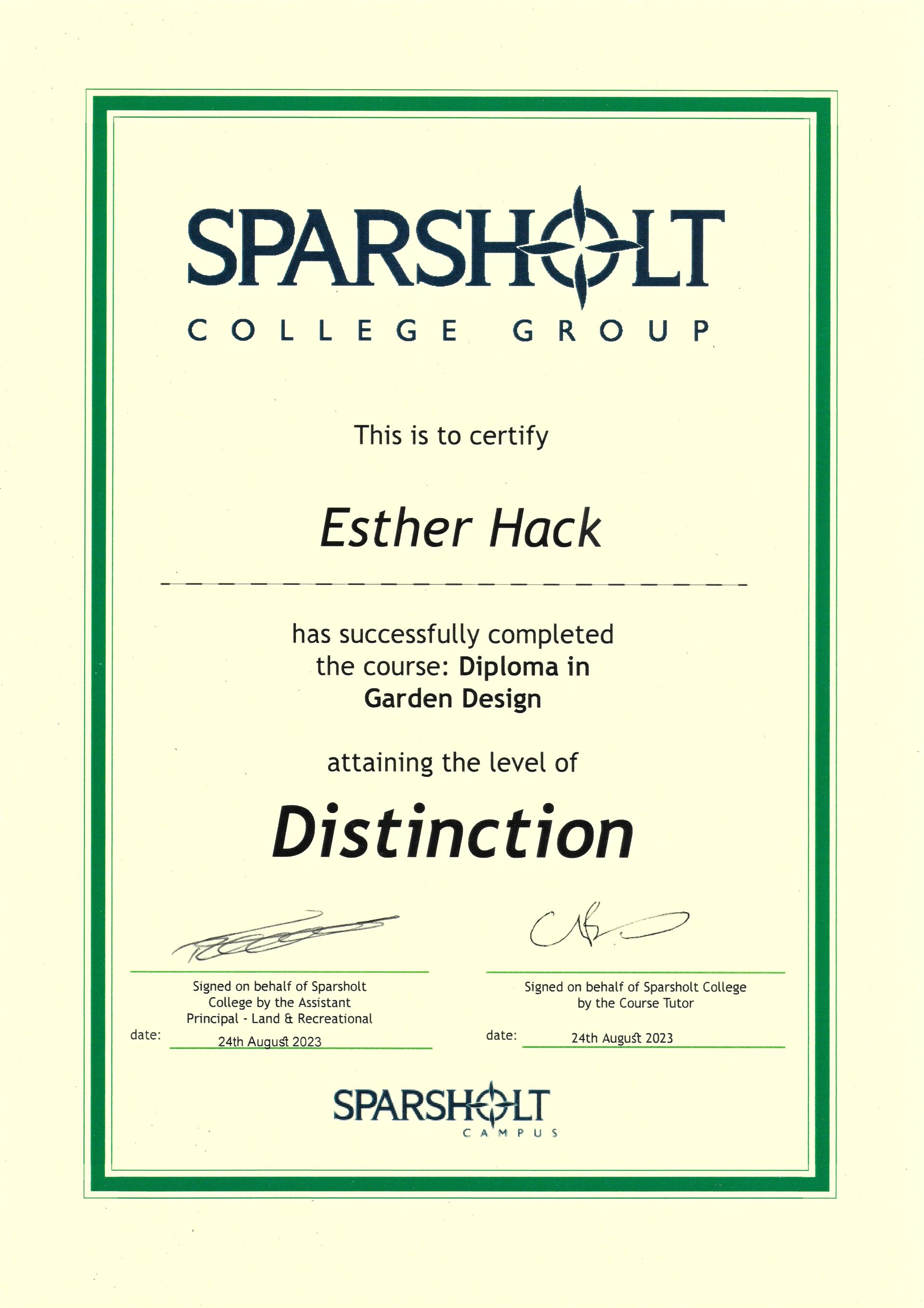 I graduated with a Diploma with Distinction in Garden Design at the internationally reputed Sparsholt College. The three year course was excellent, thorough and wide ranging.